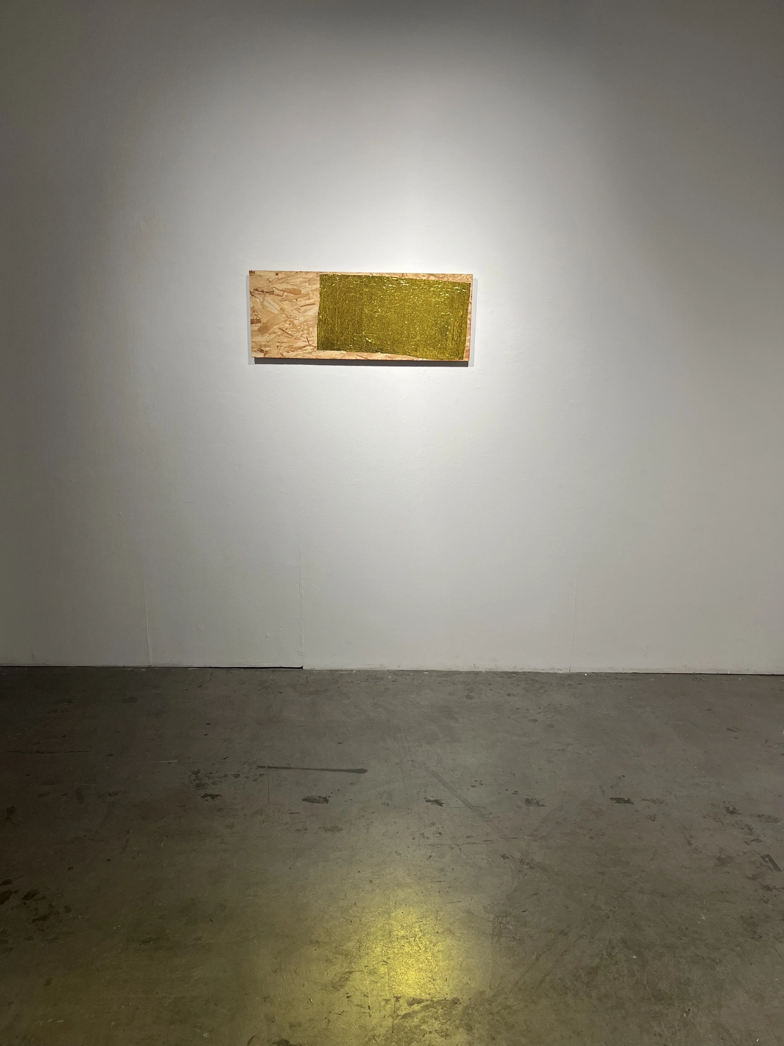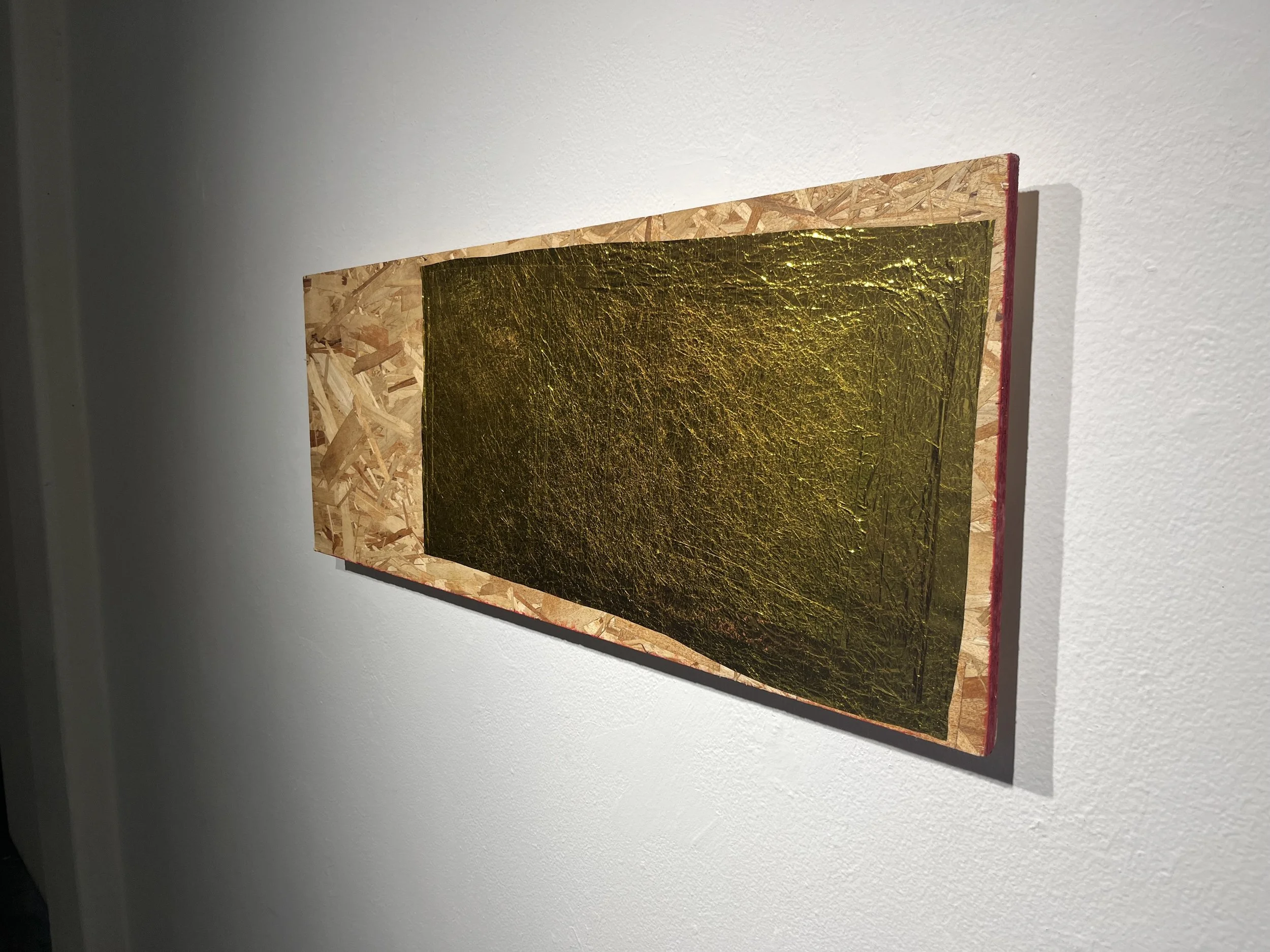 "New Suprematism (for Kazimir)": three layers of used survival blanket on Oriented Strand Board (OSB), (29" x 2" x 11")